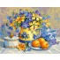 stramin stilleben, blauw/gele bloemen met abrikozen